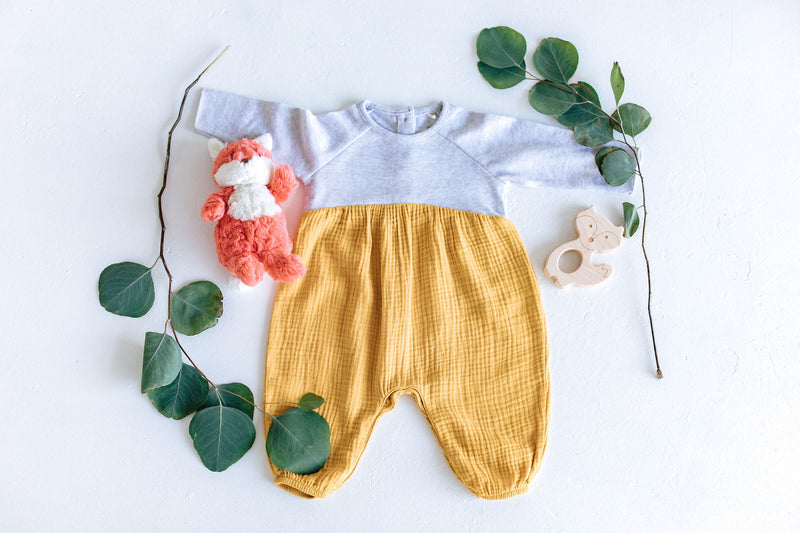 Grey and yellow romper is made with organic cotton, environmentally friendly dye, and is Standard 100 by Oeko-Tex certified