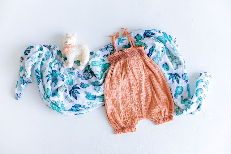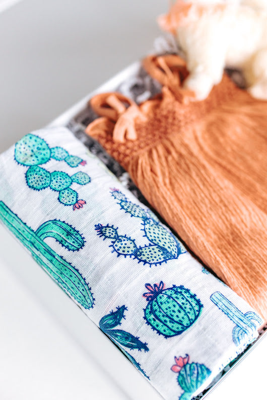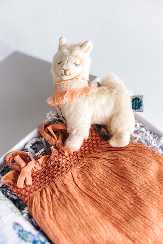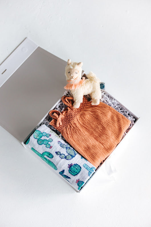 Baby girl will adore the love of a llama in this fun, bright gift set! It is filled with a coral textured cotton jumpsuit, a vivid cactus patterned blanket, and a precious fluffy white llama plushie. We love the good vibes of this desert themed gift box - a Peanut & Posie favorite!