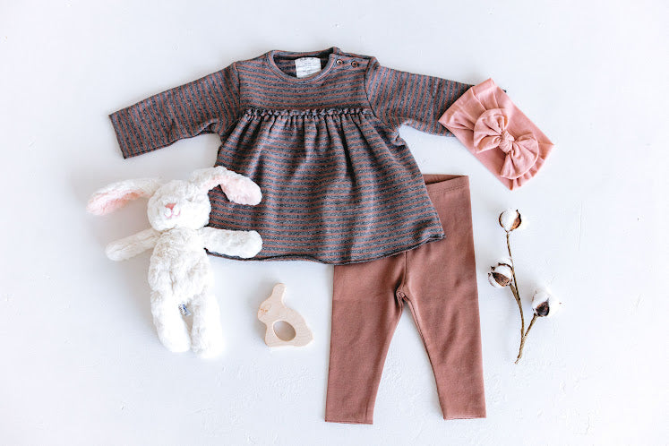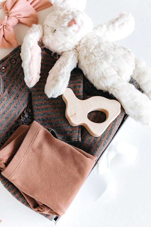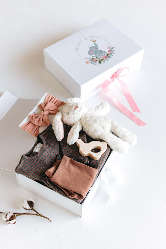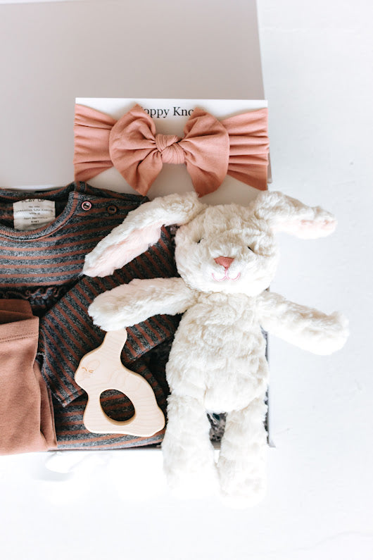 Celebrate the joy of a new little baby girl hopping into the world! She will be ready to hippity-hop in her striped top, matching stretchy leggings and blush toned bow headband. Complete with a fluffy, floppy-eared bunny plushie and a wooden bunny toy, this delightful gift collection will make loved ones say “hop hop hooray!” A Peanut & Posie BESTSELLER that makes the best baby shower gift!