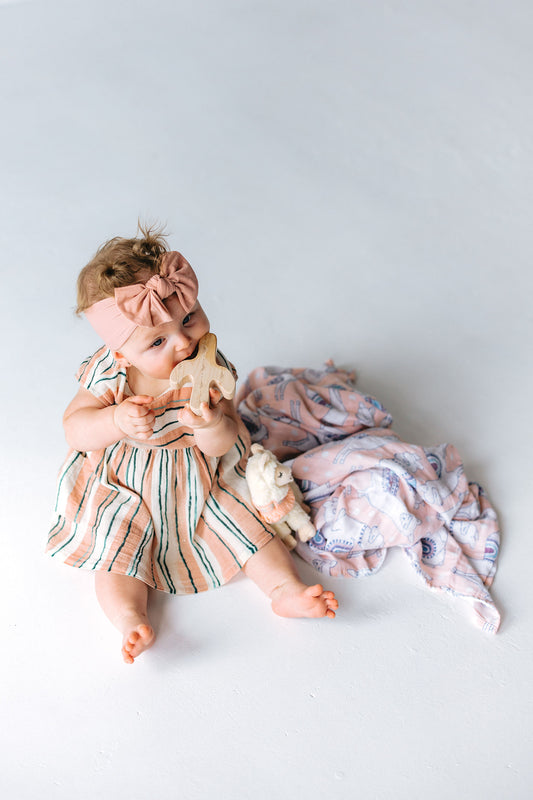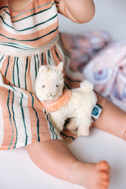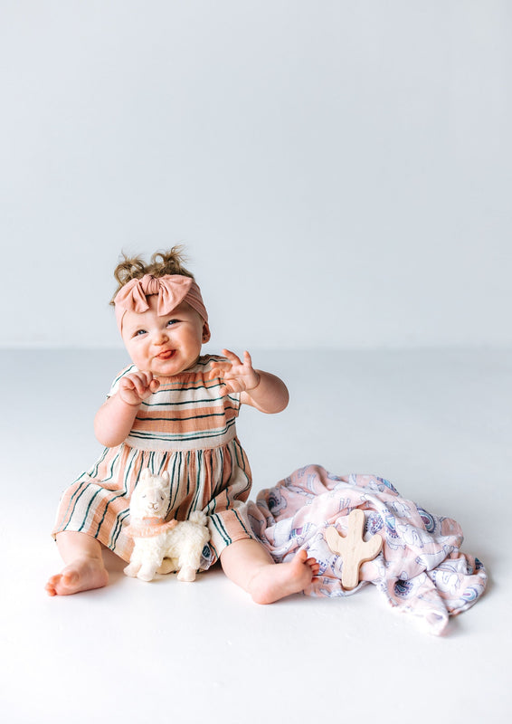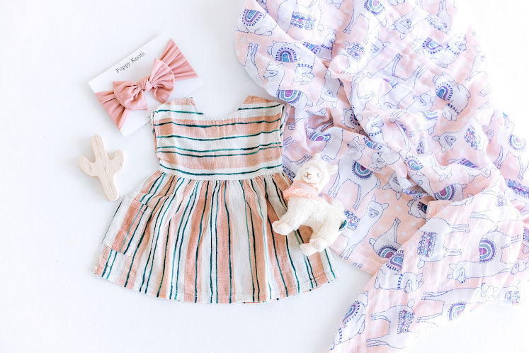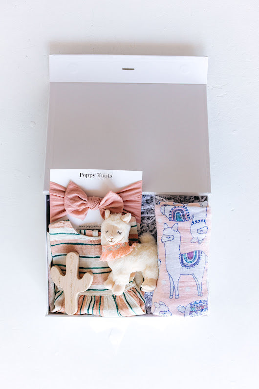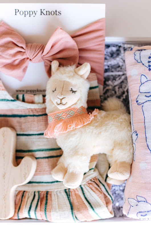 Live with joy, laugh with passion, and llama...with this playfully cheerful collection! The simplest things bring the brightest of smiles in this set that includes an organic dress, a blush bow headband, a colorful llama-adorned blanket, a natural wooden cactus teether and a fluffy llama plushie. This fun and unique gift set is a Peanut & Posie favorite!