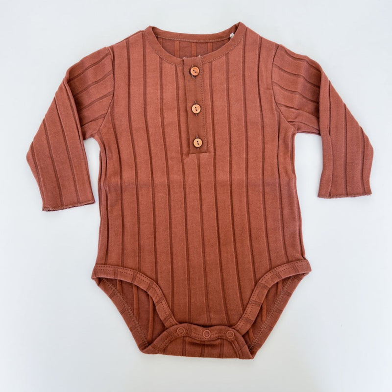Long sleeve brick onesie made from organic cotton and Standard 100 by Oeko-Tex Certified non-toxic.