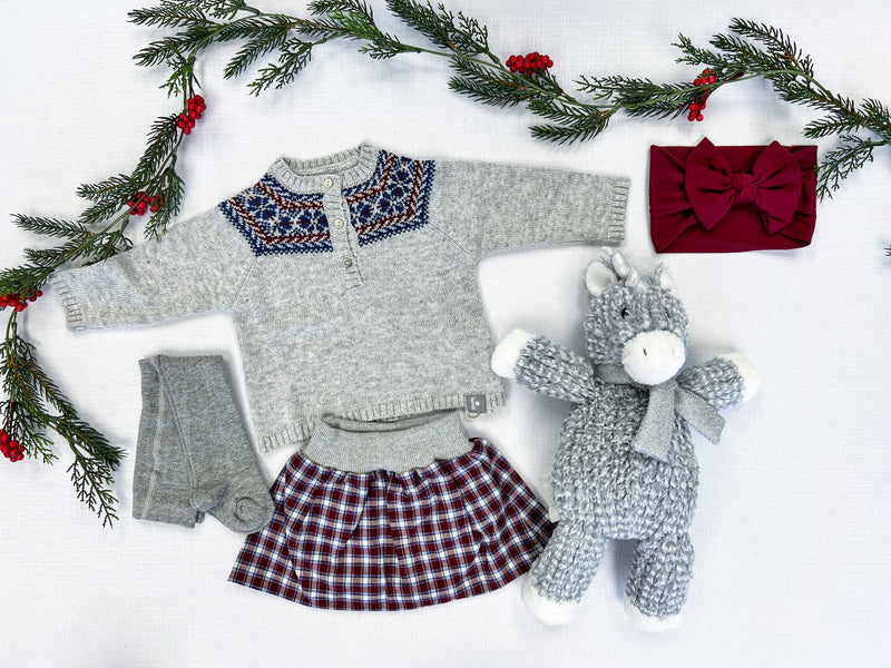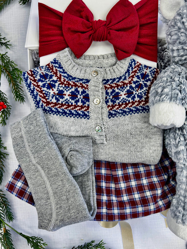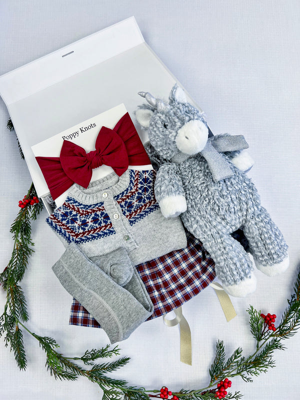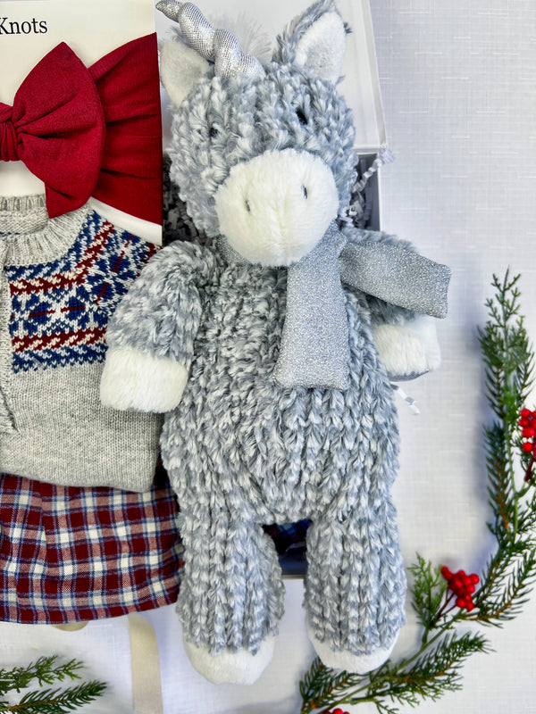 This festive gift set is absolutely perfect for the cheerful holiday season. Santa’s Little Helper will be holiday ready in her 3-piece outfit that includes a fair isle knit sweater, warm leggings, and a plaid skirt. The Merry and Bright gift box is complete with a bow headband and a sparkly unicorn plushie!