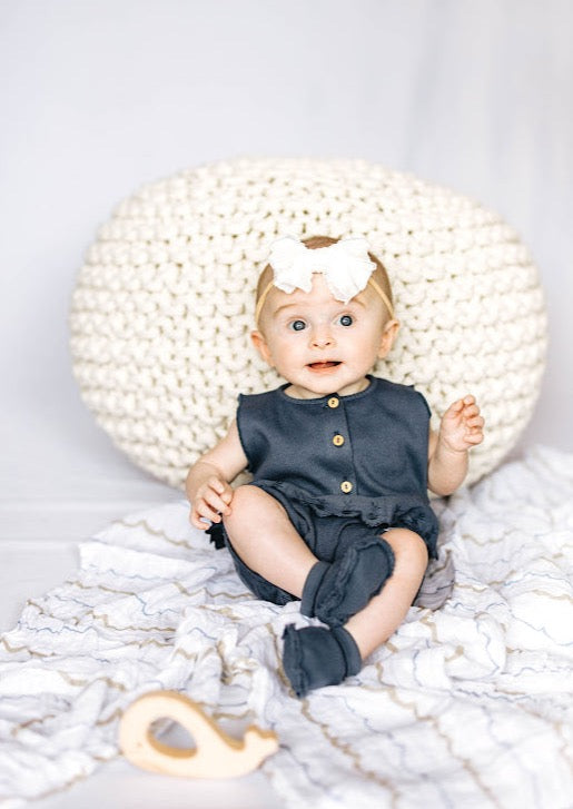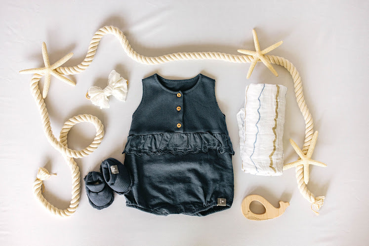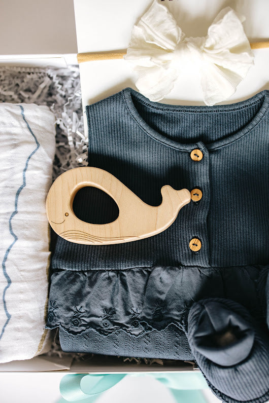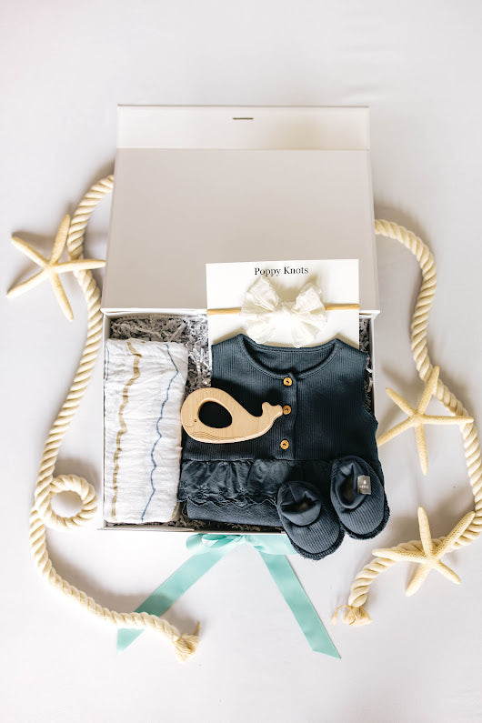 Ahoy matey! Your little seafarer will be ready to set sail this summer with this nautical inspired gift set filled with goodies reminiscent of the ocean, including a wave design swaddle and a wooden whale teether. Complete with a navy bubble romper with matching booties and white bow headband, this outfit is perfect for those sunny days by the water.