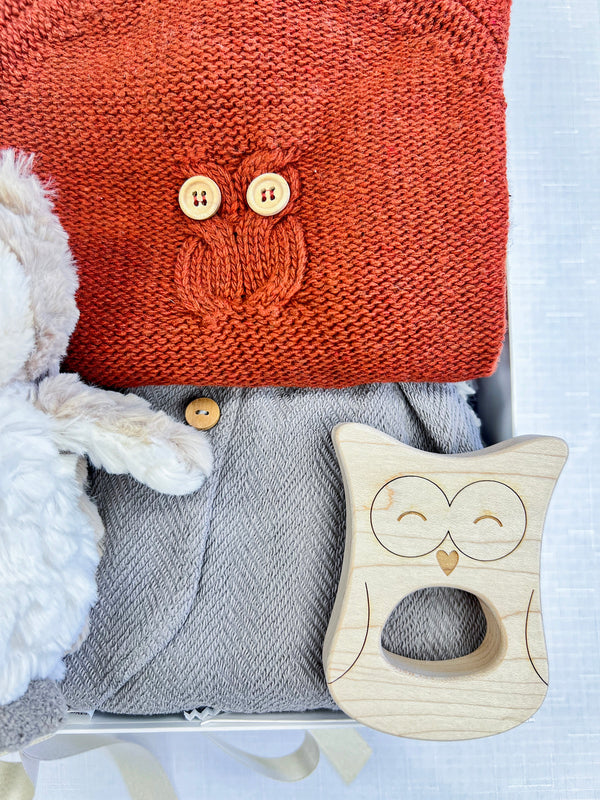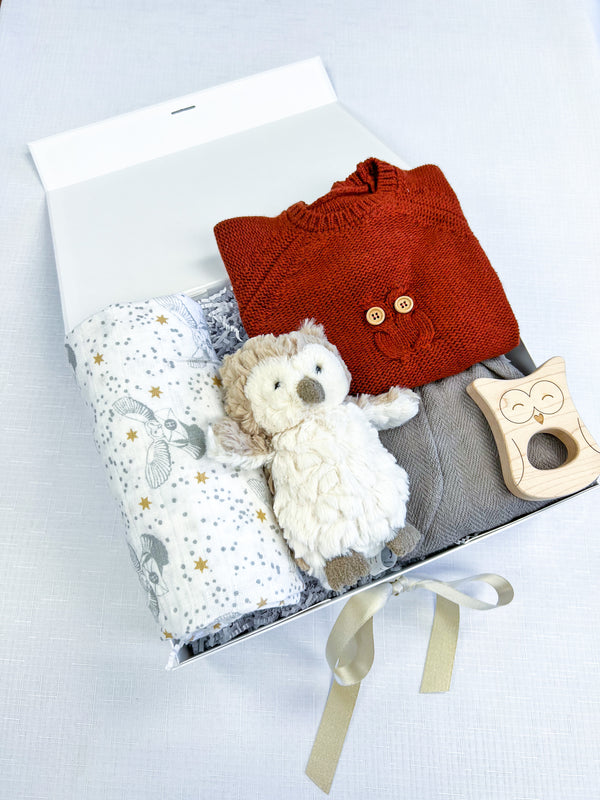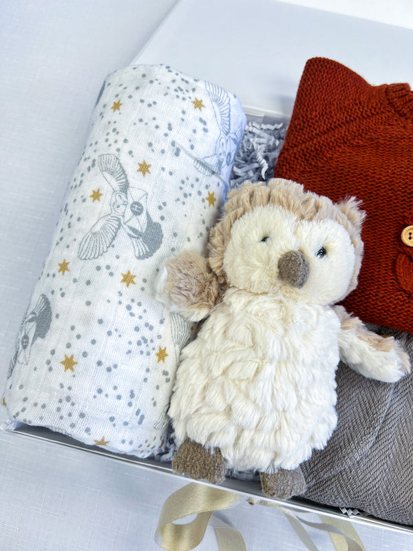 This gift set is perfect for the Harry Potter fan in your life! It features a beautiful muslin swaddle adorned with our favorite mail delivery owl, Hedwig, as he flies through the sky carrying important Hogwarts correspondence. This gift also includes some owl theme items, including an owl shaped teething toy, a plushie friend, and a cozy knit sweater and pants set.