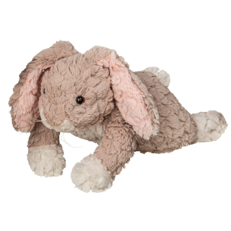 Super soft and and made from luxurious, textured fabric that is perfect for cuddling! Neutral colored plush with simple, understated design. Beans in bum and limbs, plastic eyes eyes. 17" laying on belly.