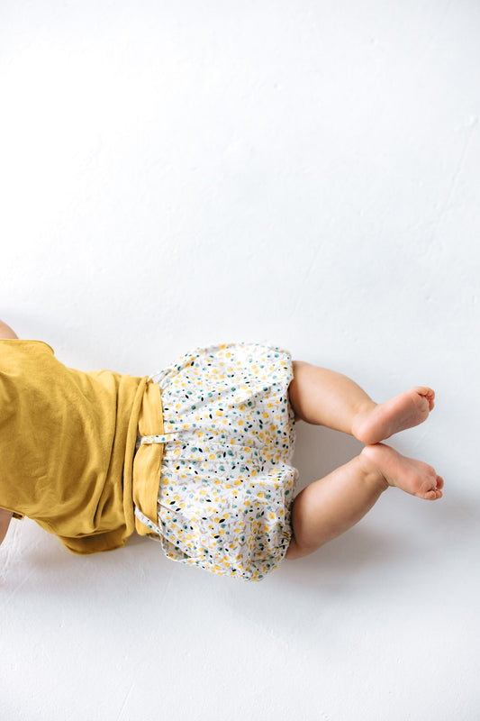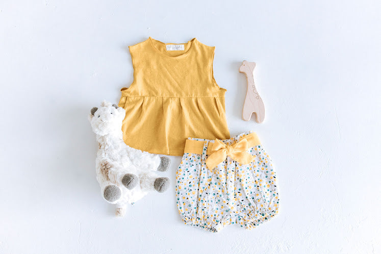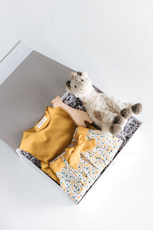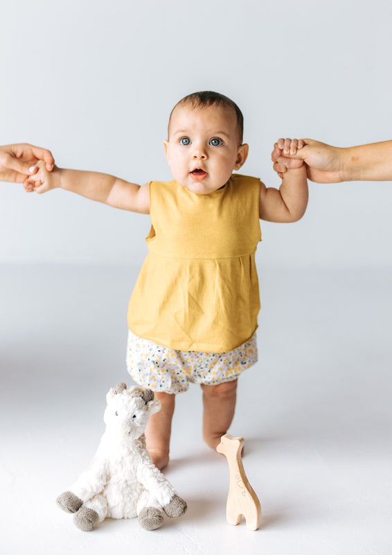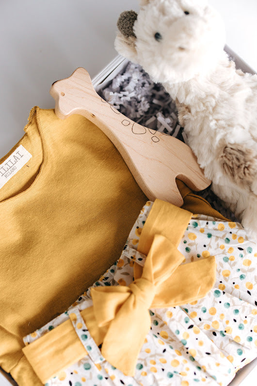 From baby’s crawl to growing tall, you’ll be filled with pride at every sweet stride! Celebrate this precious time with a gift set that includes a sunny yellow shirt and floral bow-adorned shorts, wooden teether and a fluffy giraffe plushie to play with... for years to come.