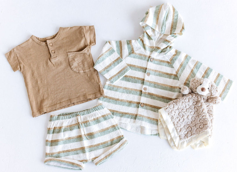 Set includes t-shirt, jacket and shorts made from organic cotton and Standard 100 by Oeko-Tex Certified non-toxic.
