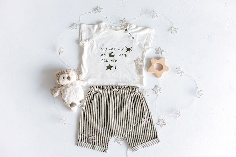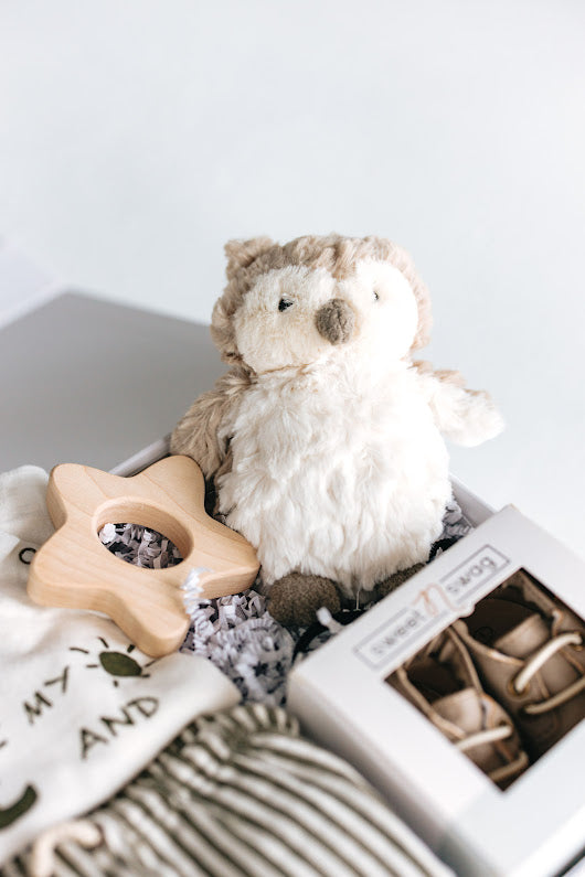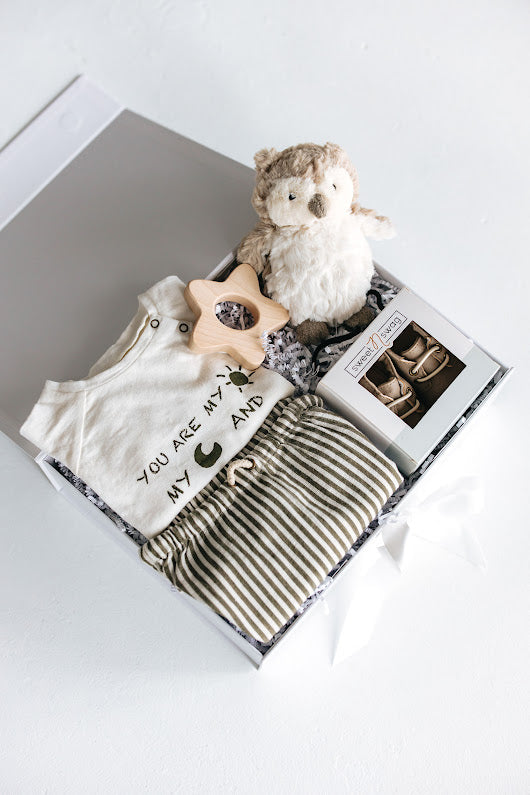Your whole universe is wrapped up in one little package—baby boy deserves the coziest, softest, sweetest gift box on Earth! Inside you’ll discover an adorable graphic tee, stylish striped shorts, a brown wooden star teether and a cuddly owl friend.