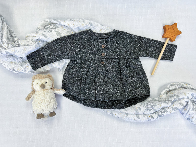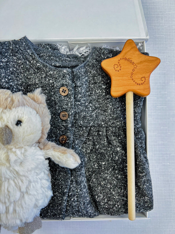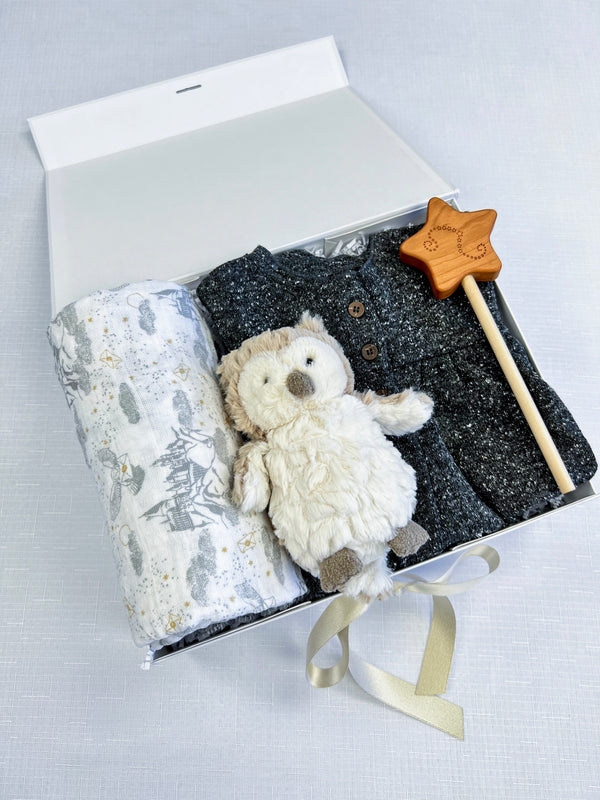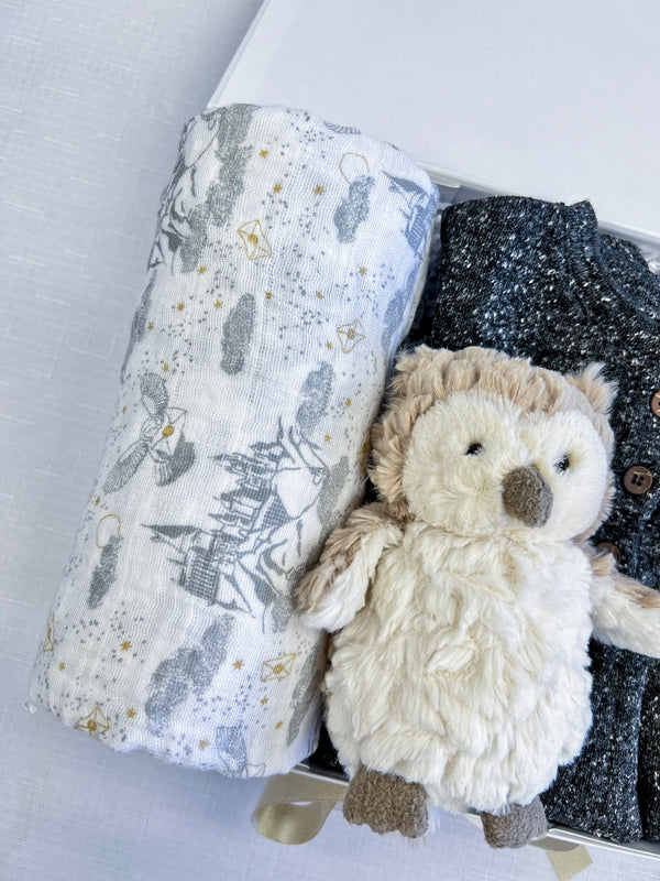 Wingardium leviosa! Cloak up and get your wands ready, it’s time for some magic! This Harry Potter inspired gift set includes a warm grey top, a little owl plushie friend, a handcrafted wooden wand, and a muslin swaddle featuring the infamous Hogwarts castle.