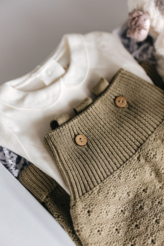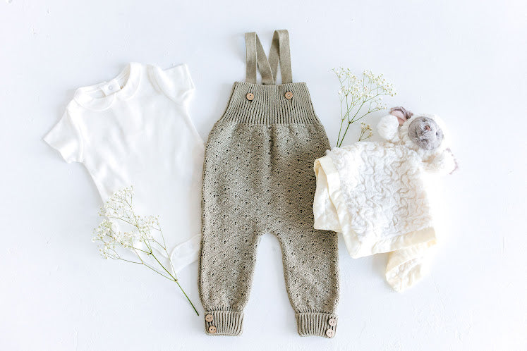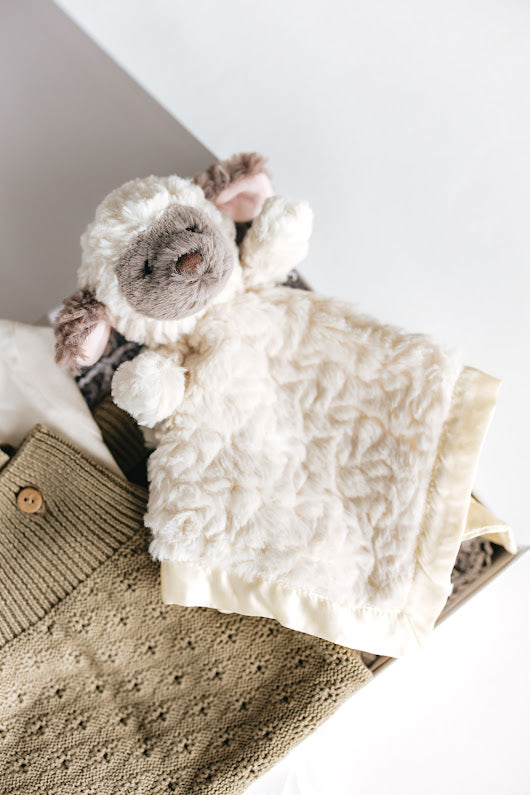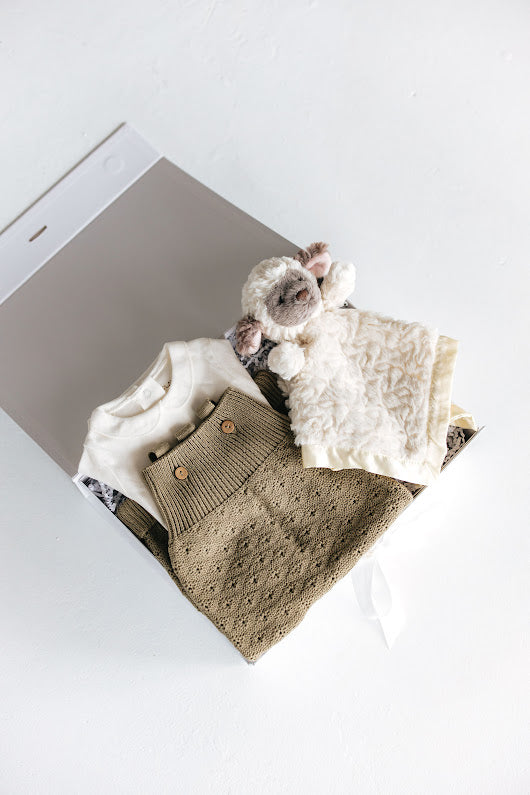 3...2...1...they're fast asleep, cuddling with the sweetest of sheep! This snuggly gift set will keep baby girl stylish and cozy in a knit sage-green overall set with natural brown button accents, a cream colored onesie and a soft cloudy-white sheep security blanket. We adore this sweet gift set for baby showers, sprinkles and new baby arrivals.