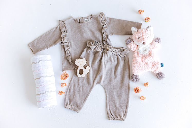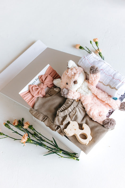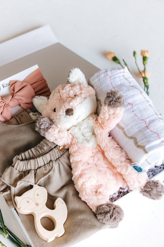 Who says baby can’t be both comfy and stylish? Baby girls will be so cozy and chic in this matching sweat set adorned with sassy ruffles. This trendy gift collection also includes a beautiful blush bow headband, a soft muslin blanket to snuggle with, a fluffy pink fox lovey and natural wooden fox teething toy. We love this gift set for fall and winter babies!