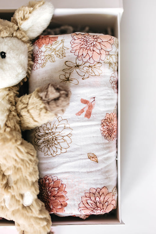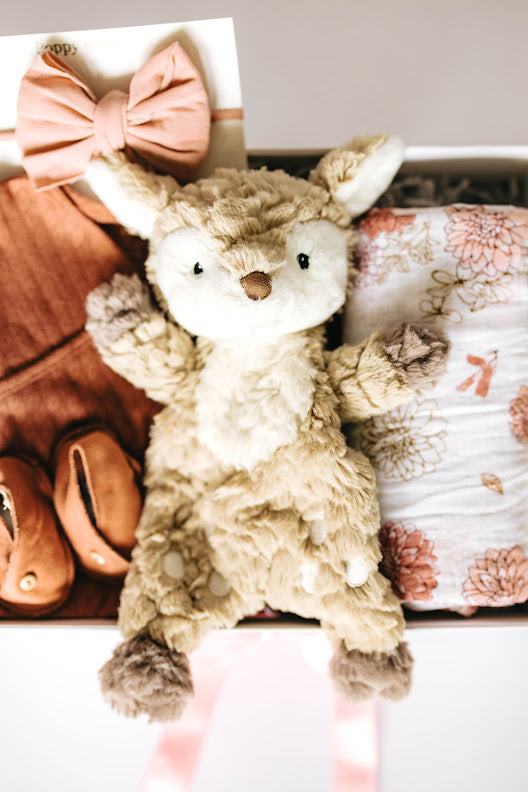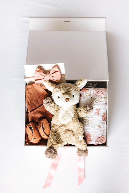 Sweet dear, oh how you are so loved! This is a thoughtfully curated gift to celebrate a loved one’s little bundle of joy - perfect for baby showers, sprinkles, or as a welcome home gift. The Fawns & Flowers Box is perfectly sweet for baby girl and filled with beautiful warm colors that parents will absolutely adore. A Peanut & Posie favorite!
