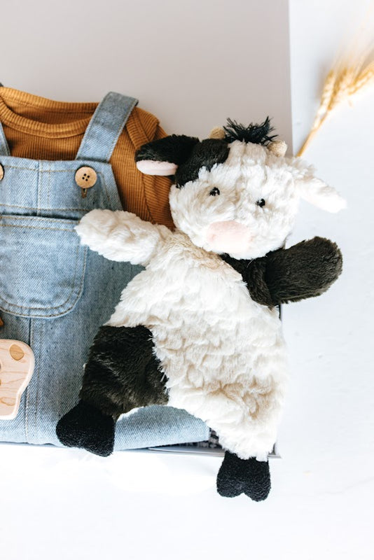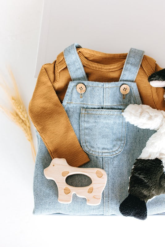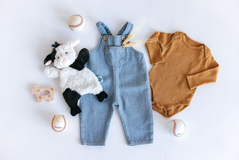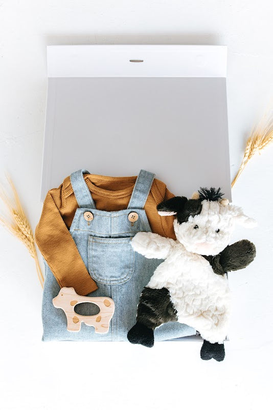 Farm friends and blue jeans honor good ol’ Americana with this adorable curated gift box. Little farmers will be ready to play in the hay with their plush cow lovey while wearing their blue denim overalls and golden long sleeve onesie. We love this as a baby shower or baby sprinkle gift that new parents can use as baby grows!