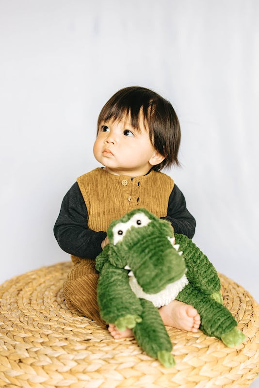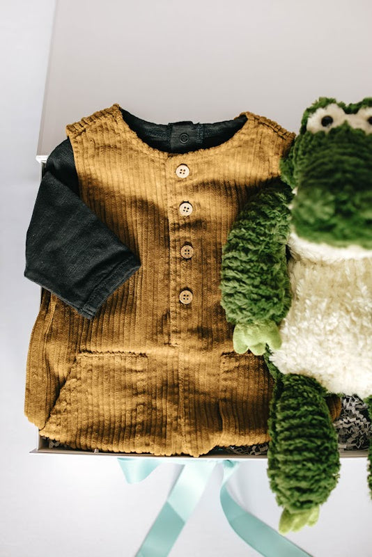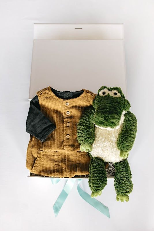 Our favorite little man is heading down to the blue bayou for some alligator adventures! Baby boy is ready to go in his golden corduroy overalls and organic long sleeve tee. We can’t forget about our cozy alligator plushie to complete this everglades themed baby gift box.